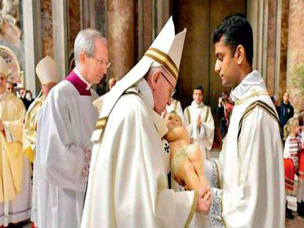 വിശ്വാസികള് തിങ്ങി നിറഞ്ഞ സെന്റ് പീറ്റേഴ്സ് ബസലിക്കയിലെ അള്ത്താരക്ക് മുന്നില് നിര്മ്മിച്ചിരുന്ന പുല്ക്കൂട്ടിനുള്ളിലാണ് ഫ്രാന്സിസ് പാപ്പ ചുംബനം നല്കിയ ശേഷം കൈമാറിയ ഉണ്ണിയേശുവിനെ അനുരാജ് പ്രതിഷ്ഠിച്ചത്.