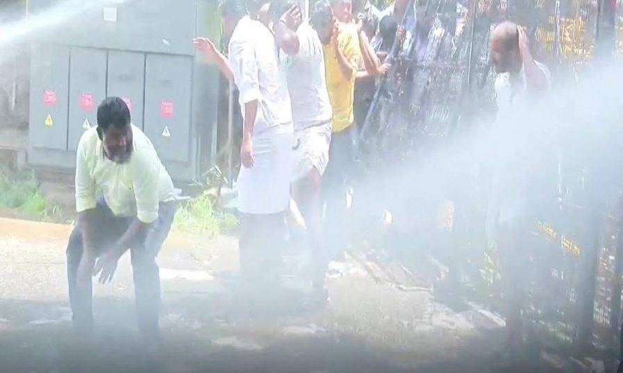 ബാരിക്കേഡുകള് ഉപയോഗിച്ച് പ്രവര്ത്തകരെ തടയാന് ശ്രമിച്ച പോലീസിന് നേരെ പ്രവര്ത്തകര് തീപ്പന്തവും കല്ലും എറിഞ്ഞു. തീപ്പന്തം പോലീസുകാര്ക്ക് നേരെ വലിച്ചെറിഞ്ഞതോടെ ജലപീരങ്കി പ്രയോഗിക്കുകയായിരുന്നു. നാല് തവണ പോലീസിന് ജലപീരങ്കി പ്രയോഗിച്ചിട്ടും പ്രവര്ത്തകര് പിന്മാറായതോടെ പൊലീസ് ലാത്തി വീശി.