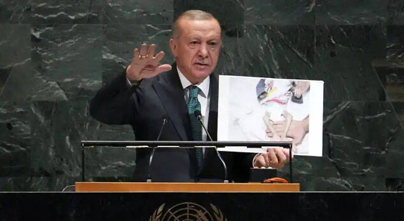 പലസ്തീനെ നിരവധി രാജ്യങ്ങള്‍ അംഗീകരിക്കുന്ന സമയത്ത് പലസ്തീന്‍ അതോറിറ്റി പ്രസിഡന്റ് മഹ്മൂദ് അബ്ബാസിനെയും അധികൃതര്‍ക്കും വിസ നിഷേധിച്ചതിനെ കുറിച്ച്‌ പറഞ്ഞാണ് എര്‍ദൊഗാന്‍ ഐക്യരാഷ്ട്ര സഭജനറല്‍ അസംബ്ലിയിലെ തന്റെ പ്രസംഗം ആരംഭിച്ചത്.
