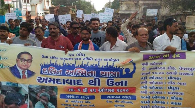 സംഘപരിവാര് ഭീകരതക്കെതിരെ ഗുജറാത്തിലെ ദളിതര് പത്ത് ദിവസമായി തുടരുന്ന അസ്മിത(അഭിമാന)മാര്ച്ചിന്റെ ഭാഗമായി സ്വാതന്ത്യ്രദിനത്തില് തോട്ടിപ്പണിയില് നിന്നും സ്വാതന്ത്യ്രം പ്രഖ്യാപിച്ച് ദേശീയ പതാക ഉയര്ത്തി. മാര്ച്ച് ഞായറാഴ്ച വൈകിട്ടാണ് ഉനയിലെത്തിയത്. പശുവിന്റെ തോലുരിച്ചതിന്റെ പേരില് ദളിത് യുവാക്കളെ മൃതപ്രായരാക്കിയതിനെതിരെ തിളച്ചുമറിയുന്ന രോഷവുമായി എത്തിയ മാര്ച്ചിനെ പതിനായിരങ്ങളാണ് ഉനയിലേക്ക് വരവേറ്റത്. നാലിന് അഹമ്മദാബാദില് നിന്നാണ് ജിഗ്നേഷ് മേവാനിയുടെ നേതൃത്വത്തില് മാര്ച്ച് ആരംഭിച്ചത്.