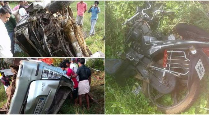 നിര്ത്താതെ കുതിച്ച കാറിനെ ചിലര് മറ്റു വാഹനത്തില് പിന്തുടര്ന്നു. ചമ്രവട്ടം പെരുന്തല്ലൂരില് മറ്റൊരു വാഹനത്തെ മറികടക്കുന്നതിനിടെ എതിരെ വന്ന ബൈക്കിനെ ഇടിച്ചു തെറിപ്പിക്കുകയായിരുന്നു. നിയന്ത്രണംവിട്ട കാര് വയലിലേക്കു മറിഞ്ഞു. കാറിലുണ്ടായിരുന്ന രണ്ടു പേര്ക്കും പരുക്കേറ്റു.