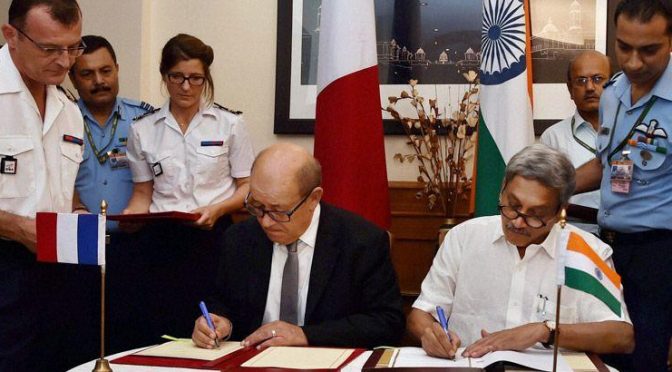 36 റാഫേല് യുദ്ധവിമാനങ്ങള് ഫ്രാന്സില്നിന്നു ഇന്ത്യന് വ്യോമസേനയ്ക്കു വേണ്ടി വാങ്ങാനുള്ള കരാറില് ഒപ്പുവച്ചു. 60,000 കോടിയോളം രൂപയുടെ ഇടപാടാണിത്. ഫ്രഞ്ച് പ്രതിരോധ മന്ത്രി ജീന് യെവ്സ് ലെഡ്രിയാനും ഇന്ത്യന് പ്രതിരോധ മന്ത്രി മനോഹര് പരീക്കറുമാണ് കരാറില് ഒപ്പുവച്ചത്. ഏറെ അനിശ്ചിതത്വം ഉണ്ടായിരുന്നെങ്കിലും പ്രധാനമന്ത്രി മോദിയുടെ ഫ്രാന്സ് സന്ദര്ശനത്തിലാണ് റാഫേല് ജെറ്ററുകള് വാങ്ങാന് ധാരണയായത്.