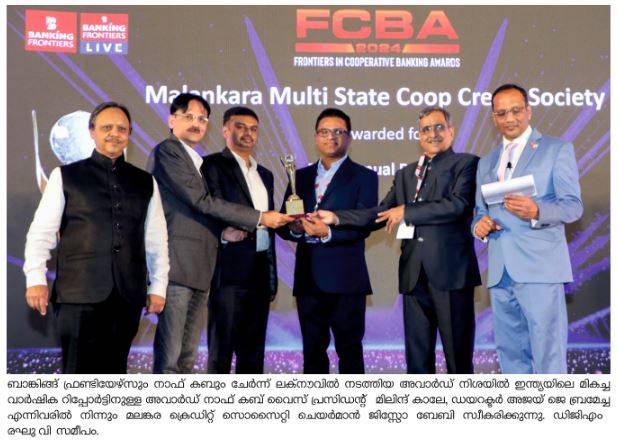ഇന്ത്യയിലെ മികച്ച വാര്ഷിക റിപ്പോര്ട്ടിനുള്ള അവാര്ഡ് മലങ്കര ക്രെഡിറ്റ് സൊസൈറ്റിക്ക് ലഭിച്ചു. ബാങ്കിങ്ങ് ഫ്രണ്ടിയേഴ്സും നാഫ് കബും ചേര്ന്ന് ലക്നൗവില് നടത്തിയ അവാര്ഡ് നിശയില് നാഫ് കബ് വൈസ് പ്രസിഡന്റ് മിലിന്ദ് കാലേ, ഡയറക്ടര് അജയ് ജെ ബ്രമേച്ച എന്നിവരില് നിന്നും മലങ്കര ക്രെഡിറ്റ് സൊസൈറ്റി ചെയര്മാന് ജിസ്സോ ബേബി അവാര്ഡ് സ്വീകരിച്ചു. ഡിജിഎം രഘു വി ചടങ്ങില് സന്നിഹിതനായിരുന്നു. കൂടുതല് വിവരങ്ങള്ക്ക് വിളിക്കുക, ടോള് ഫ്രീ:18003131223