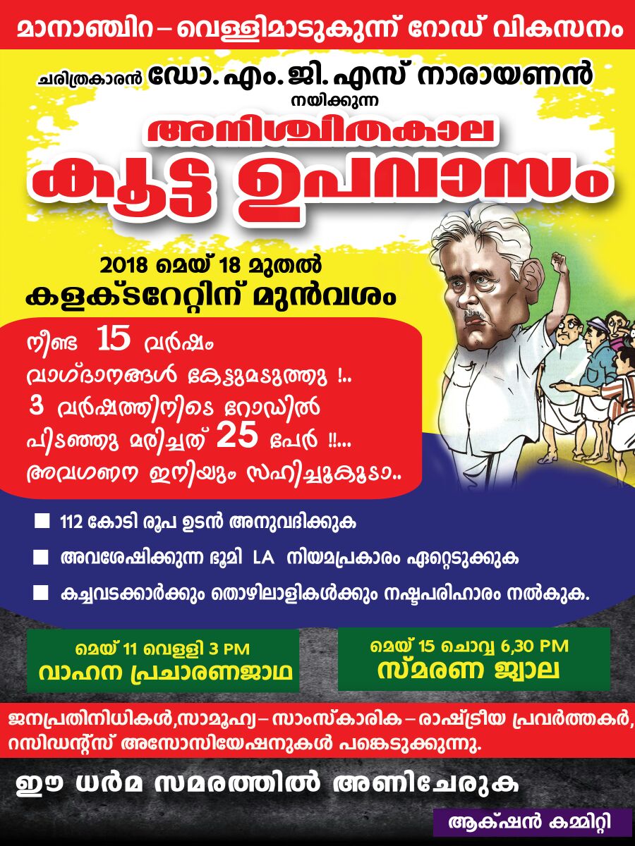 കോഴിക്കോട്: മാനാഞ്ചിറ- വെള്ളിമാടുകുന്ന് റോഡ് ആക്ഷന് കമ്മിറ്റി അനിശ്ചിതകാല കൂട്ടസമരം സംഘടിപ്പിക്കുന്നു.റോഡ് വികസനത്തിനു മുഴുവന് ഫണ്ടും അനുവധിക്കണമെന്നാവശ്യപ്പെട്ട് കലക്ടറേറ്റിനു മുന്നില് ചരിത്രകാരന് ഡോ എം.ജി.എസ് നാരായണന്റെ നേതൃത്വത്തിലാണ് ഉപവാസസമരം സംഘടിപ്പിക്കുക.സമരത്തിന്റെ ഭാഗമായി വാഹന പ്രചരണ ജാഥയും,സ്മരണ ജ്വാലയും സംഘടിപ്പിക്കുന്നു.സമരത്തിന്റെ ഭാഗമായി ആരംഭിക്കുന്ന വാഹന പ്രചരണജാഥ കമ്മിറ്റി വര്ക്കിങ് പ്രസിഡന്റ് നയിക്കുന്ന ജാഥ മെയ് 11 ന് ഉച്ച കഴിഞ്ഞ് മൂന്നൂ മണിക്ക് വെള്ളിമാടുകുന്ന് ജെഡിടി സ്കൂള് പരിസരത്തുനിന്നാരംഭിക്കും. പത്ത് കേന്ദ്രങ്ങളിലെ വിശദീകരണത്തിനു ശേഷം വൈകിട്ട് കിഡ്സണ് കോര്ണറില് അവസാനിക്കും.