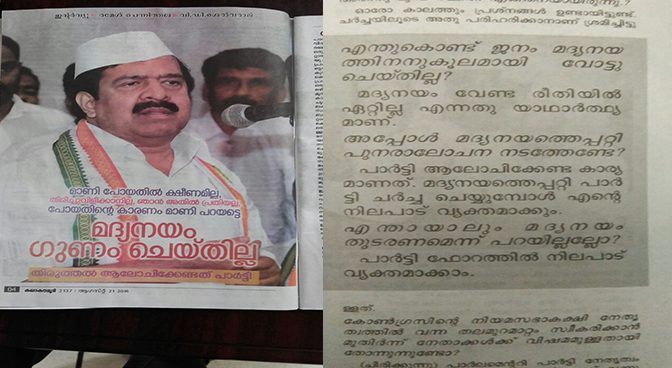 കലാകൗമുദിക്ക് നല്കിയ അഭിമുഖത്തിലാണ് ചെന്നിത്തല യുഡിഎഫ് സര്ക്കാരിന്റെ മദ്യനയത്തെ വിമര്ശിച്ച് രംഗത്തെത്തിയിരിക്കുന്നത്. മദ്യനയത്തിലുള്ള തന്റെ നിലപാട് പാര്ട്ടി ഫോറത്തില് വ്യക്തമാക്കുമെന്നും അഭിമുഖഖത്തില് ചെന്നിത്തല ചൂണ്ടിക്കാട്ടുന്നു. മദ്യനയം പുന:പ്പരിശോധിക്കുന്നതിനെ കുറിച്ച് പാര്ട്ടി ആലോചിക്കണമെന്നും അദ്ദേഹം പറയുന്നു.