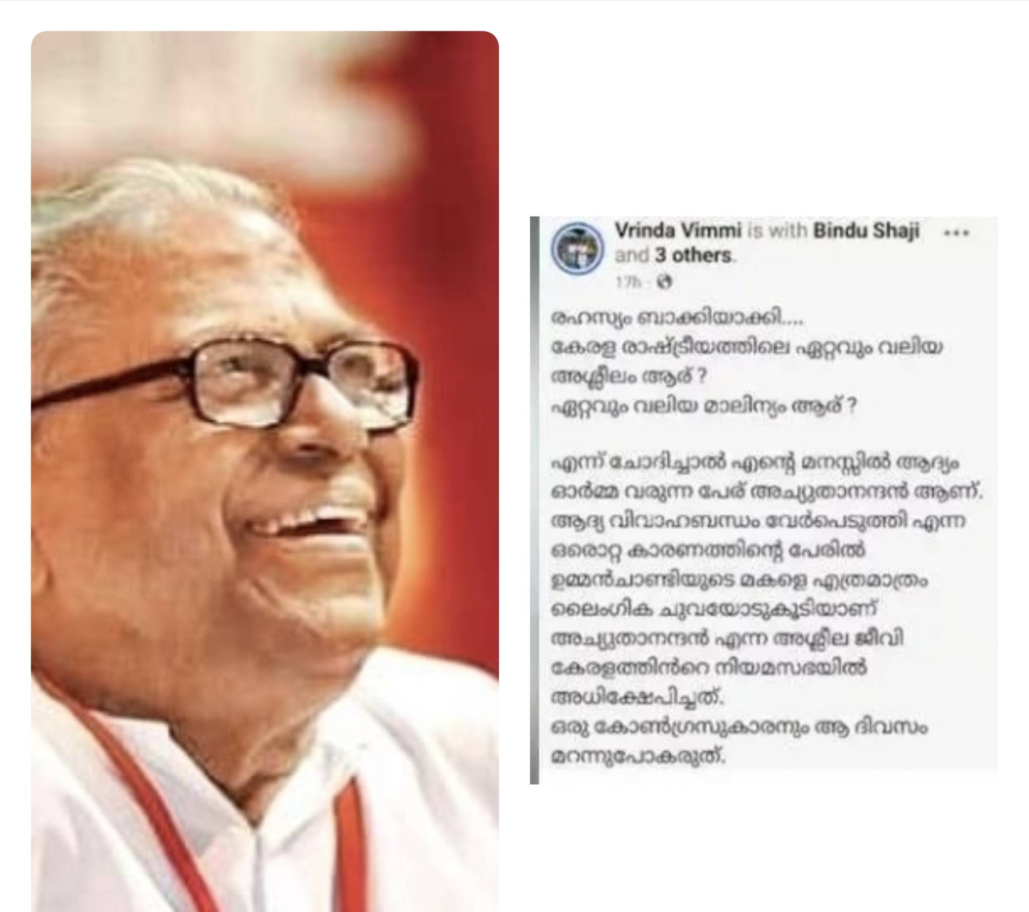 അന്തരിച്ച മുൻ മുഖ്യമന്ത്രി വി എസ് അച്യുതാനന്ദനെതിരെ അധിക്ഷേപ പോസ്റ്റിട്ട കോണ്ഗ്രസ് പ്രവർത്തകയ്ക്കെതിരെ കേസെടുത്തു.എറണാകുളം ഏലൂരിലെ പ്രാദേശിക കോണ്ഗ്രസ് പ്രവർത്തകയായ വൃന്ദ വിമ്മിക്കെതിരെയാണ് കേസ്.