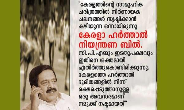 കഴിഞ്ഞ മാര്‍ച്ച്‌ 29ന് ഹര്‍ത്താല്‍ നിയന്ത്രണ ബില്‍ നിയമസഭയില്‍ അവതരിപ്പിച്ചതിനെക്കുറിച്ച്‌ ചെന്നിത്തലയുടെ ഔദ്യോഗിക പേജില്‍ പോസ്റ്റ് ചെയ്ത് കുറിപ്പും സോഷ്യല്‍ മീഡിയയില്‍ വീണ്ടും പ്രചരിക്കുന്നുണ്ട്.
