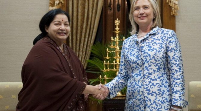2011 ജൂലൈയില് രാജ്യം സന്ദര്ശിച്ച ഹിലരി ജയലളിതയുമായി കൂടിക്കാഴ്ച്ച നടത്തിയിരുന്നു. ഇതാണ് ഹിലരിക്ക് പ്രസിഡന്റ് സ്ഥാനാര്ഥിയാവാനുള്ള പ്രചോദനം നല്കിയതെന്നായിരുന്നു എം.എല്.എയുടെ വാദം.