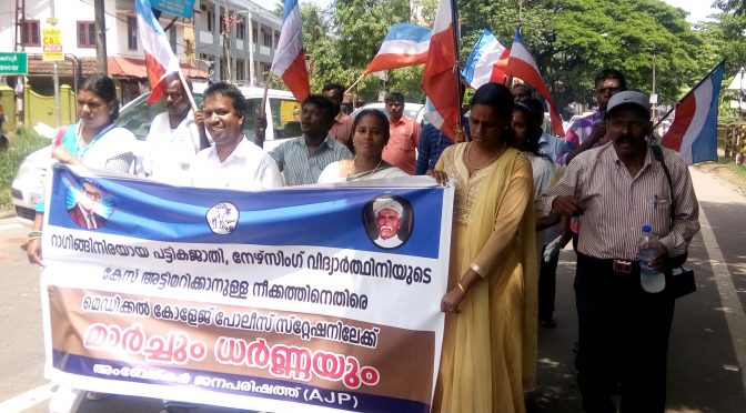 കോഴിക്കോട് :കൽ ബുർഗി റാഗിംങ്ങിന് ഇരയായ അശ്വതിയുടെ കേസ് അട്ടിമറിക്കാനുള്ള നീക്കം തടയണമെന്നാവശ്യപ്പെട്ട് മെഡിക്കൽ കോളെജ് പോലിസ് സ്റ്റേഷനിലേക്ക് അംബേദ്കർ ജന പരിക്ഷത്ത് മാർച്ചും ധർണ്ണയും നടത്തി.മാർച്ച് സംസ്ഥാന പ്രസിഡന്റ് രാമദാസ് വേങ്ങേരി ഉദ്ഘാടനം ചെയ്തും.കർണ്ണാടക പോലീസും കോളെജ് മാനേജ്മെൻറും കേസ് അട്ടിമറിക്കാൻ ശ്രമിക്കുകയാണ്ന്ന് അദ്ദേഹം ആരോപിച്ചും. ഏത് സർക്കാർ മാറി മാറി വന്നാലും പട്ടികജാതി പട്ടികവർക്കകാർക്ക് നേരെയുള്ള അതി (കമത്തിന് ഒരു കുറവും മില്ലന്നു താൻ ഒരു പട്ടികവർഗ്ഗക്കാരനാണ്ന്ന് തുറന്ന് പറയാൻ മടിക്കുന്ന ഒരു മന്ത്രിയാണ് പട്ടികജാതി വകുപ്പിന്റെ മ(ന്തി എന്നും അദ്ദേഹം കുറ്റപ്പെടുത്തി.മാർച്ച് പോലീസ് സ്റ്റേഷന് മുന്നിൽ പോലീസ് തടഞ്ഞും. മാർച്ചിനും ധർണ്ണയ്ക്കും ച(ന്ദിക അജേഷ്, ബാലൻ പുല്ലാള്ളൂർ, കെ.പി.ഭാസ്കരൻ എന്നിവർ നേ(തത്വം നൽകി.