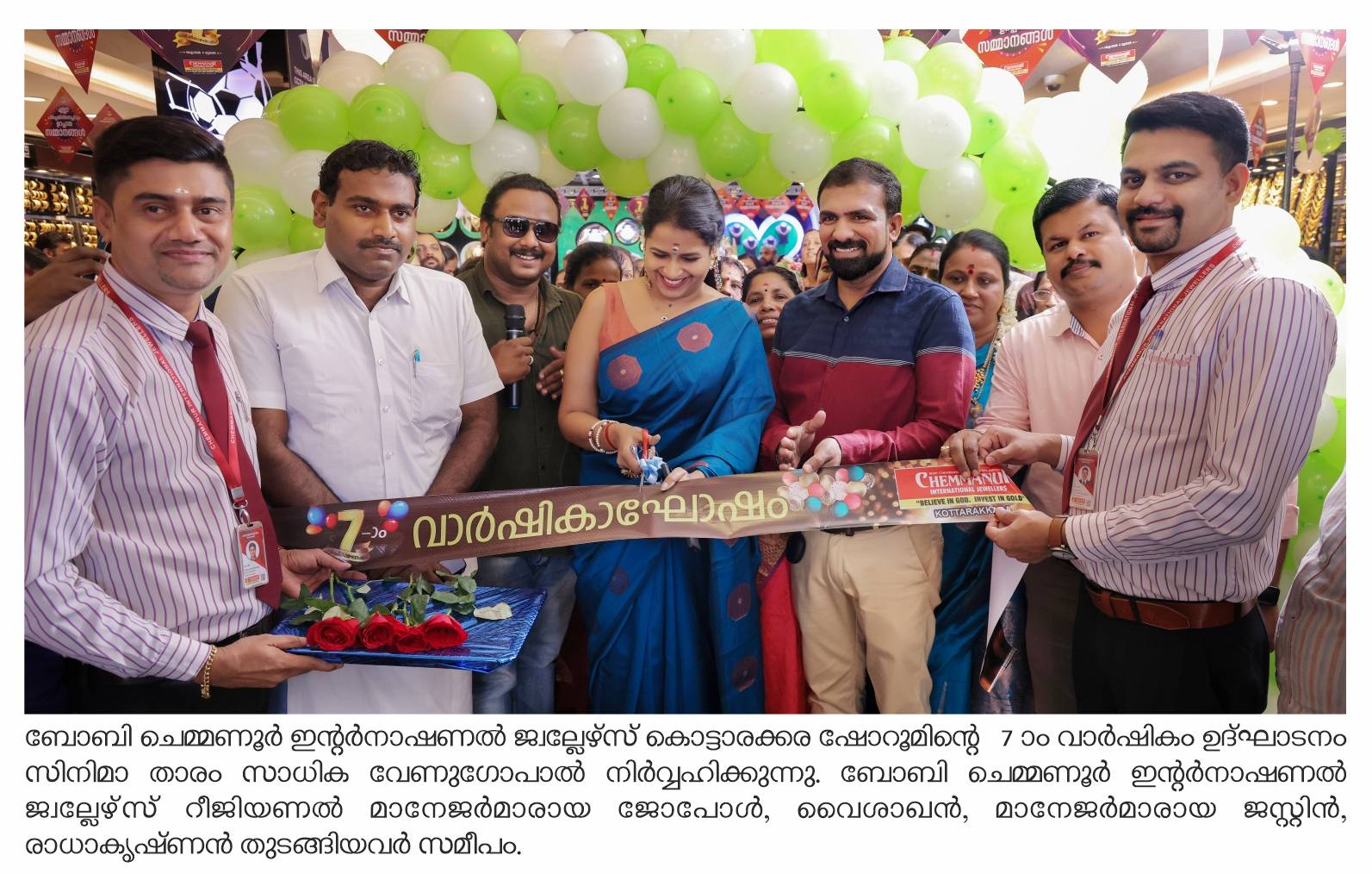 ബോബി ചെമ്മണൂര് ഇന്റര്നാഷണല് ജ്വല്ലേഴ്സ് കൊട്ടാരക്കര ഷോറൂമിന്റെ 7 ാം വാര്ഷികം ഉദ്ഘാടനം ചെയ്തു. സിനിമാ താരം സാധിക വേണുഗോപാല് ഉദ്ഘാടനം നിര്വ്വഹിച്ചു. ബോബി ചെമ്മണൂര് ഇന്റര്നാഷണല് ജ്വല്ലേഴ്സ് റീജിയണല് മാനേജര്മാരായ ജോപോള്, വൈശാഖന്, മാനേജര്മാരായ ജസ്റ്റിന്, രാധാകൃഷ്ണന് തുടങ്ങിയവര് ചടങ്ങില് സംബന്ധിച്ചു.