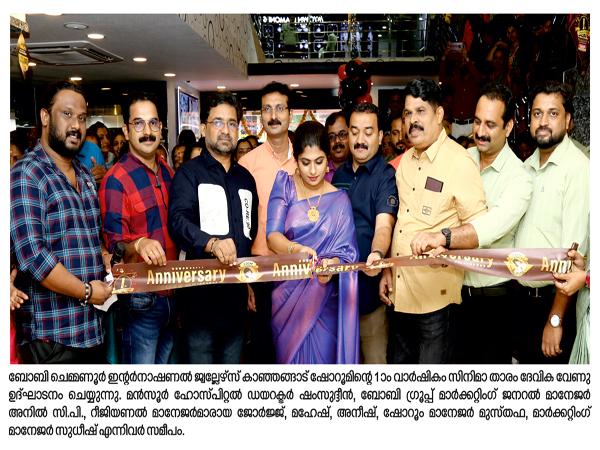 ബോബി ചെമ്മണൂര് ഇന്റര്നാഷണല് ജ്വല്ലേഴ്സ് കാഞ്ഞങ്ങാട് ഷോറൂമിന്റെ 1 ാം വാര്ഷികം ഉദ്ഘാടനം ചെയ്തു. സിനിമാ താരം ദേവിക വേണു ഉദ്ഘാടനം നിര്വ്വഹിച്ചു. മന്സൂര് ഹോസ്പിറ്റല് ഡയറക്ടര് ഷംസുദ്ദീന്, ബോബി ഗ്രൂപ്പ് മാര്ക്കറ്റിംഗ് ജനറല് മാനേജര് അനില് സി.പി., റീജിയണല് മാനേജര്മാരായ ജോര്ജ്ജ്, മഹേഷ്, അനീഷ്, ഷോറൂം മാനേജര് മുസ്തഫ, മാര്ക്കറ്റിംഗ് മാനേജര് സുധീഷ് എന്നിവര് ചടങ്ങില് സംബന്ധിച്ചു.