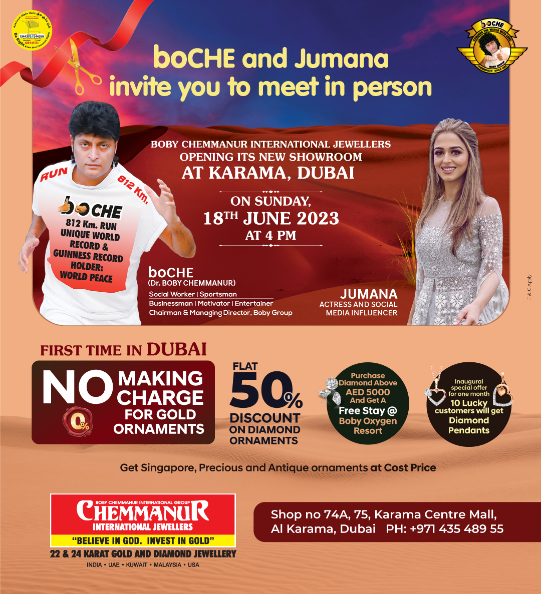 സ്വര്ണാഭരണ രംഗത്ത് 160 വര്ഷത്തെ വിശ്വസ്ത പാരമ്പര്യമുള്ള ബോബി ചെമ്മണൂര് ഇന്റര്നാഷണല് ജ്വല്ലേഴ്സിന്റെ ഏറ്റവും പുതിയ ഷോറൂം ദുബായ് കരാമയില് പ്രവര്ത്തനമാരംഭിക്കുന്നു. ജൂണ് 18 ഞായറാഴ്ച വൈകുന്നേരം 4 മണിക്ക് 812 കിലോമീറ്റര് റണ് യുനീക് വേള്ഡ് റെക്കോര്ഡ് ഹോള്ഡറും ലോകസമാധാനത്തിനുള്ള ഗിന്നസ് ജേതാവുമായ ബോചെ (ഡോ. ബോബി ചെമ്മണൂര്) യും നടിയും സോഷ്യല് മീഡിയ ഇന്ഫ്ളുവന്സറുമായ ജുമാനയും ചേര്ന്ന് ഉദ്ഘാടനം ചെയ്യും. കൂടാതെ പ്രമുഖ സോഷ്യല് മീഡിയ ഇന്ഫ്ളുവന്സേഴ്സും ചടങ്ങില് പങ്കെടുക്കും.