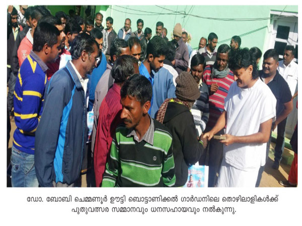 പ്രമുഖ ജീവകാരുണ്യ പ്രവര്ത്തകനും 812 കിലോമീറ്റര് റണ് യുനീക് വേള്ഡ് റെക്കോര്ഡ് ഹോള്ഡറും ബിസിനസ്മാനുമായ ഡോ. ബോബി ചെമ്മണ്ണൂര് ഊട്ടി ബൊട്ടാണിക്കല് ഗാര്ഡനിലെ തൊഴിലാളികള്ക്കൊപ്പം പുതുവര്ഷം ആഘോഷിച്ചു. ഗാര്ഡനിലെ തൊഴിലാളികള്ക്ക് പുതുവത്സര സമ്മാനവും ധനസഹായവും നല്കികൊണ്ട് അവരോടൊത്താണ് ഡോ. ബോബി ചെമ്മണ്ണൂര് ഈ പുതുവര്ഷത്തെ വരവേറ്റത്. ബൊട്ടാണിക്കല് ഗാര്ഡന്റെ മനോഹാരിത കാത്തുസീക്ഷിക്കുന്ന ഈ തൊഴിലാളികളുടെ പരിശ്രമം ആരും ശ്രദ്ധിക്കാറില്ല. എല്ലാ മഹത് സൃഷ്ടികള്ക്കും പിറകില് ഇത്തരം തൊഴിലാളികളുടെ കഠിനാദ്ധ്വാനവും കഷ്ടപ്പാടകളുമുണ്ടെന്നത് നാം മറക്കരുതെന്ന് ഡോ. ബോബി ചെമ്മണ്ണൂര് പറഞ്ഞു