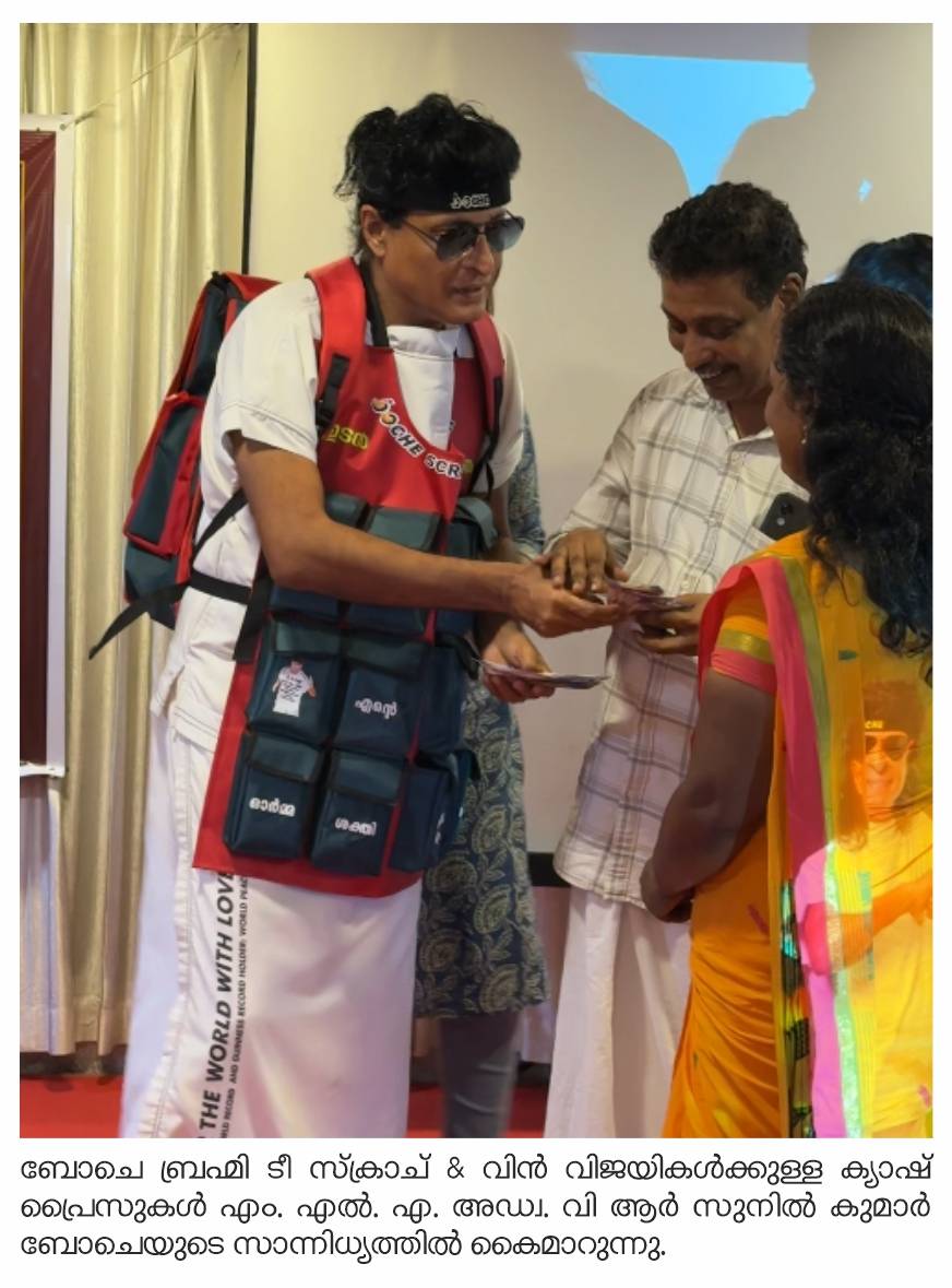 തൃശൂര്: പുതുതായി വിപണിയിലെത്തിയ ബോചെ ബ്രഹ്മി ടീ സ്ക്രാച് & വിന്നിലൂടെ സമ്മാനാര്ഹ രായവര്ക്ക് ക്യാഷ് െ്രെപസുകള് വിതരണം ചെയ്തു. എം. എല്. എ. അഡ്വ. വി ആര് സുനില് കുമാര്, 812 കി. മീ. റണ് യുനീക് വേള്ഡ് റെക്കോര്ഡ് ഹോള്ഡറും, ലോക സമാധാനത്തിനുള്ള ഗിന്നസ് റെക്കോര്ഡ് ജേതാവുമായ ബോചെയുടെ സാന്നിധ്യത്തില് ക്യാഷ് െ്രെപസുകള് കൈമാറി.