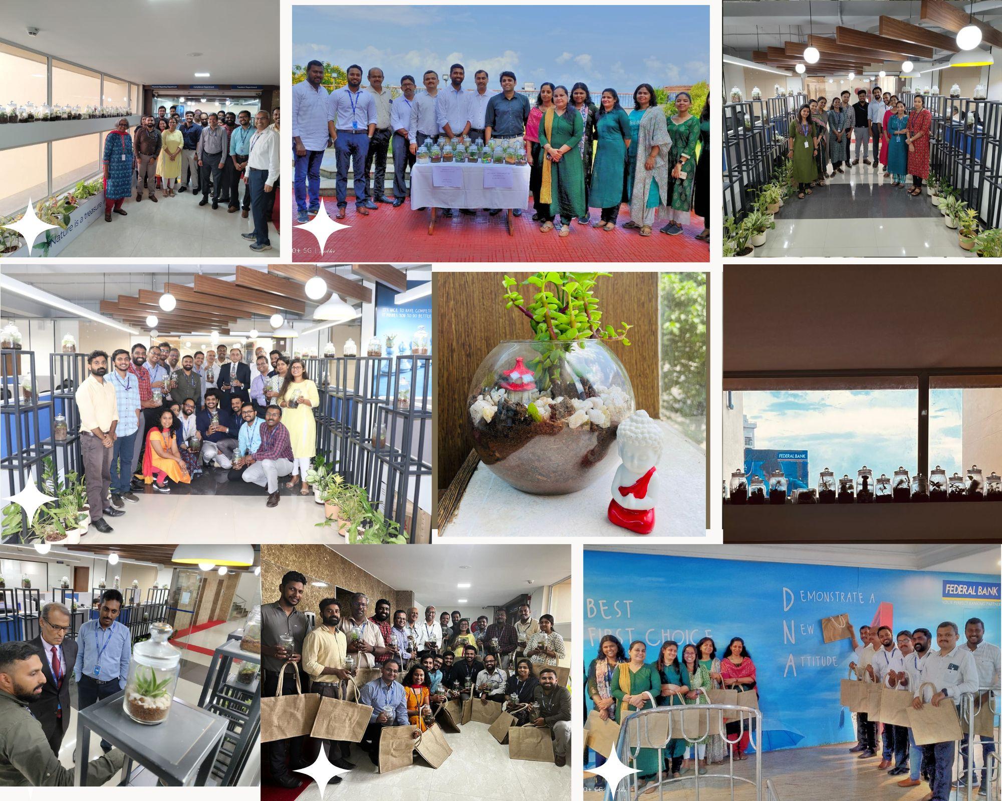കൊച്ചി: ലോക പരിസ്ഥിതി ദിനം ഇന്ത്യയിലുടനീളമുള്ള ഫെഡറല് ബാങ്ക് ശാഖകളിലെ ജീവനക്കാര് വ്യത്യസ്ത പരിപാടികളോടെ ആചരിച്ചു. ബാങ്ക് ആസ്ഥാനത്ത് ജീവനക്കാര് ഒരുക്കിയ ടെറേറിയം എക്സിബിഷന് വേറിട്ട പരിപാടിയായി. കുഞ്ഞു സ്ഫടിക പാത്രങ്ങളിൽ മണ്ണും സസ്യങ്ങളും ഉപയോഗിച്ച് സൃഷ്ടിക്കുന്ന ഉദ്യാനമാണ് ടെറേറിയം. ബാങ്ക് ജീവനക്കാര് തന്നെ ക്യൂറേറ്റ് ചെയ്ത പ്രദര്ശനം ശ്രദ്ധേയമായി.