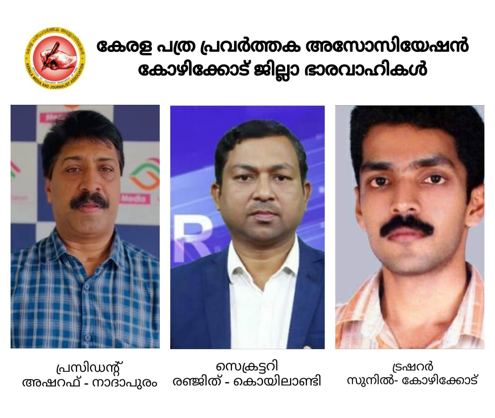 കോഴിക്കോട്: കേരള പത്ര പ്രവർത്തക അസോസിയേഷൻ കോഴിക്കോട് ജില്ലാ പ്രസിഡന്റ് ആയി എം കെ അഷ്റഫ് നാദാപുരം, ജനറൽ സെക്രട്ടറി യായി രഞ്ജിത് നിഹാര കൊയിലാണ്ടി ട്രഷററായി സുനിൽകുമാർ കോഴിക്കോട് എന്നിവരെ തെരഞ്ഞെടുത്തു.
