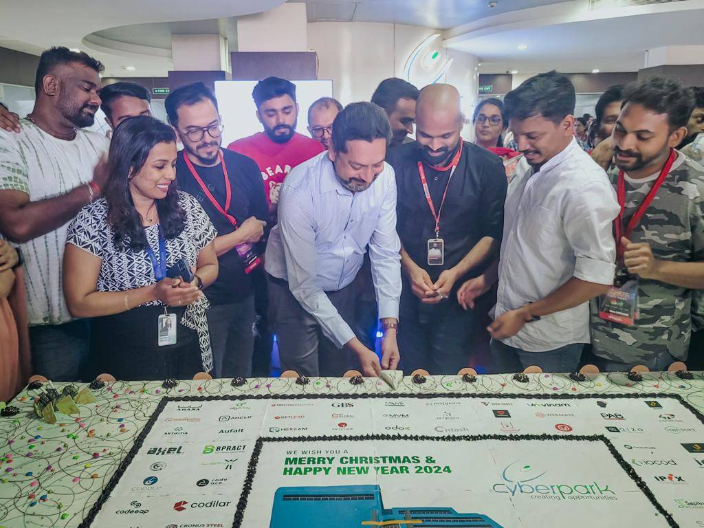 സൈബര്പാര്ക്കിലെ 84 കമ്പനികളുടെ ലോഗോ ഉള്പ്പെടുത്തിയ കേക്ക് സൈബര്പാര്ക്ക് ജനറല് മാനേജര് വിവേക് നായരും കമ്പനികളെ പ്രതിനിധീകരിച്ചു കാഫിറ്റ് സെക്രട്ടറിയും ഗെറ്റ്ലീഡ് സി.ഇ.ഓയുമായ അഖിൽ കൃഷ്ണയും ചേർന്ന് മുറിച്ച് ആഘോഷങ്ങള്ക്ക് തുടക്കമിട്ടു. സര്ക്കാര് സൈബര്പാര്ക്കിലെ ജീവനക്കാര് പങ്കെടുത്തു.