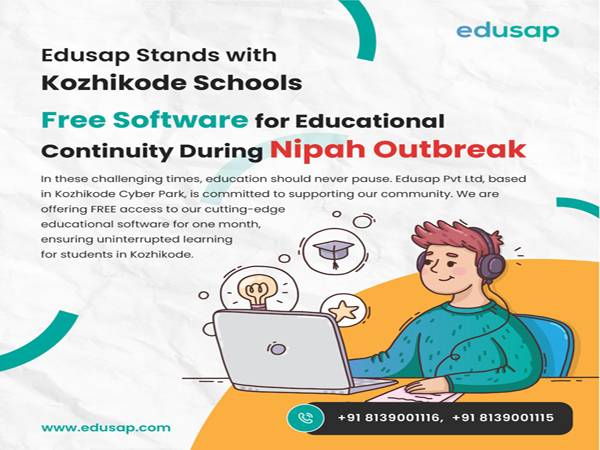 നിലവിലുള്ള നിപ്പ വൈറസ് പ്രതിസദ്ധിയെ പ്രതിരോധിക്കുന്നതിൻ്റെ ഭാഗമായി താൽക്കാലികമായി അടച്ചിട്ട സ്കൂളുകൾക്കും മറ്റ് വിദ്യാഭ്യാസ സ്ഥാപനങ്ങൾക്കും ഓണലൈൻ പഠനത്തിനായി കോഡ്സാപ്പ് ടെക്ക്നോളജീസ് അവരുടെ ആധുനിക സോഫ്റ്റ് വെയർ എഡ്യൂസാപ്പ് ഒരു മാസത്തേക്ക് സൗജന്യമായി നൽകാനാണ് ആലോചിക്കുന്നത്.