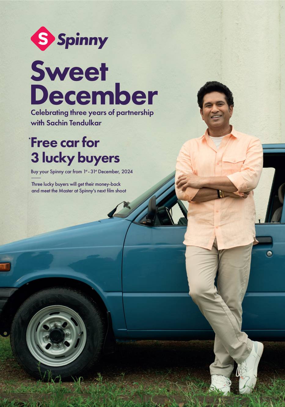 ഇന്ത്യയിലെ മുന്നിര യൂസ്ഡ് കാര് വിപണന സംവിധാനമായ സ്പിന്നി സച്ചിന് തെണ്ടുല്ക്കറുമായുള്ള പങ്കാളിത്തത്തിന്റെ മൂന്നാം വാര്ഷികാഘോഷം- സ്വീറ്റ് ഡിസംബര് കാമ്പയിന് നടത്തുന്നു. ഇതിന്റെ ഭാഗമായി നറുക്കെടുപ്പിലൂടെ ഉപഭോക്താക്കള്ക്ക് ഡിസംബറില് മൂന്നു കാറുകള് സൗജന്യമായി ലഭിക്കാനും സച്ചിന് തെണ്ടുല്ക്കറെ നേരിട്ട് കാണാനും അവസരം ഒരുക്കും.