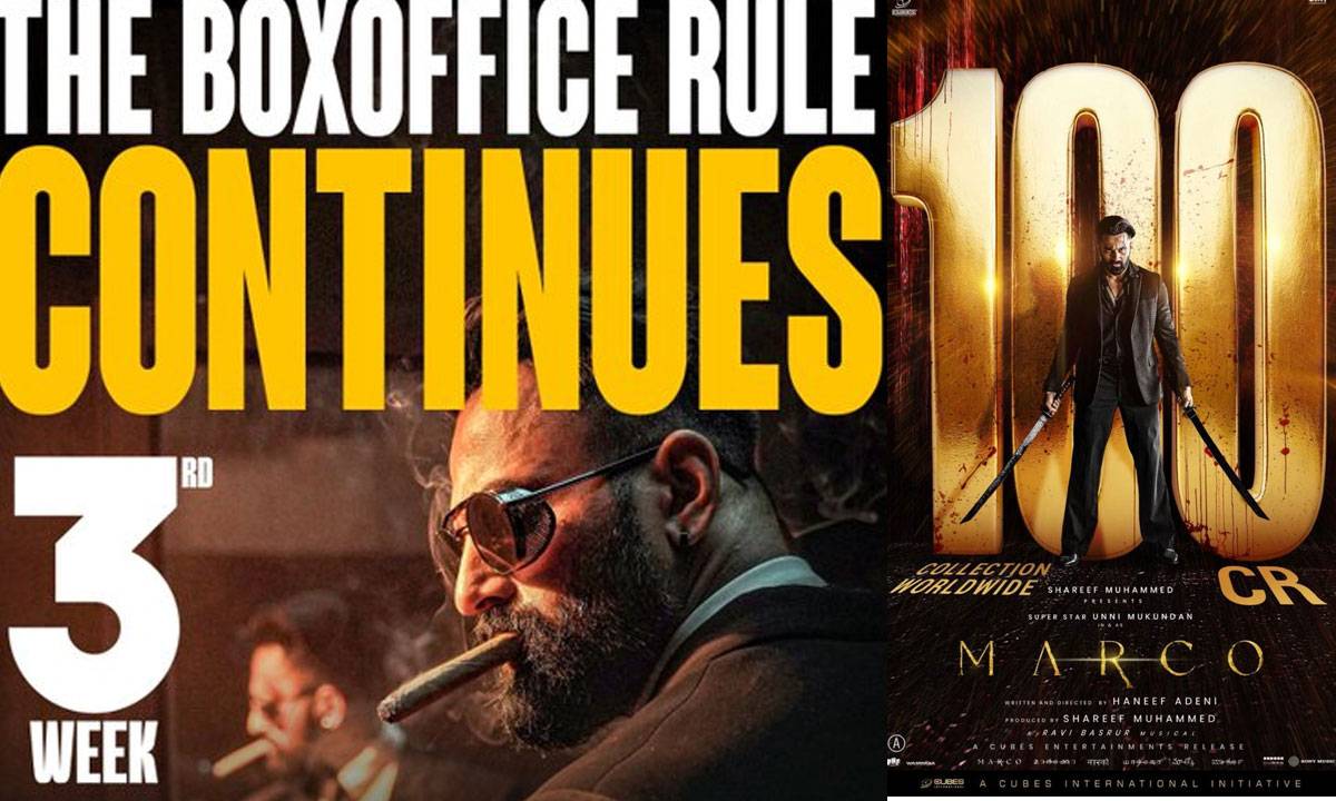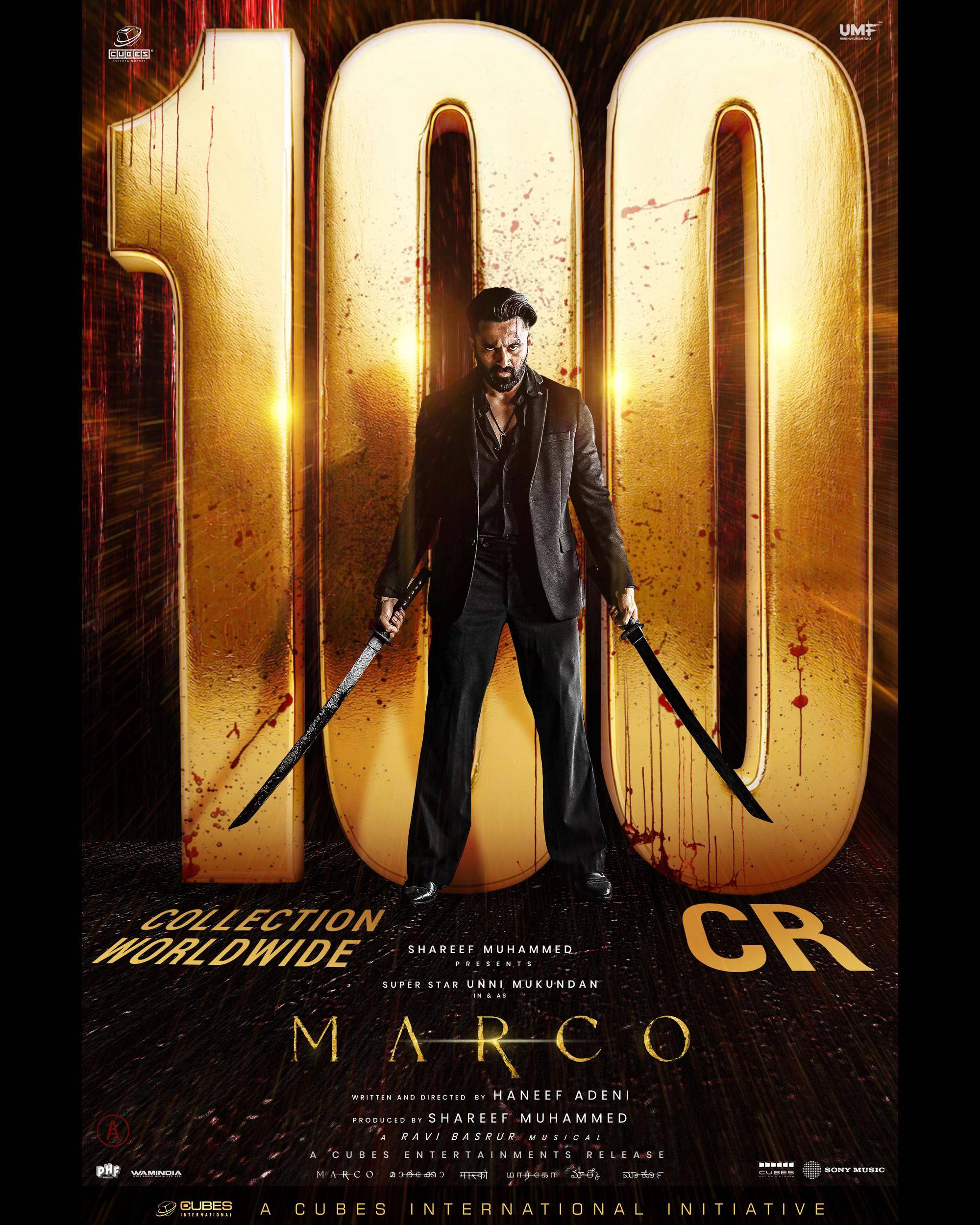 ക്യൂബ്സ് എന്റർടെയ്ൻമെന്റ്സിന്റെ ബാനറിൽ ഷെരീഫ് മുഹമ്മദ് നിർമ്മിച്ച് ഹനീഫ് അദേനി തിരക്കഥയെഴുതി സംവിധാനം നിർവഹിച്ച ഉണ്ണി മുകുന്ദൻ ചിത്രം “മാർക്കോ” 100 കോടി ക്ലബിൽ ഇടം പിടിച്ചു മലയാളം കണ്ട ഏറ്റവും വലിയ വയലൻസ് ചിത്രമായി ബെഞ്ച് മാർക്ക് കുറിച്ചു. റിലീസ് ചെയ്ത് മൂന്നാം ആഴ്ചയിലേക്ക് കടക്കുമ്പോൾ ചിത്രം 100 കോടി വേൾഡ് വൈഡ് കളക്ഷൻ കരസ്ഥമാക്കി. ഉണ്ണി മുകുന്ദന്റെ കരിയറിലെ ആദ്യ സോളോ 100 കോടി ബോക്സ് ഓഫീസ് കൂടിയാണ് ‘മാർക്കോ’.
